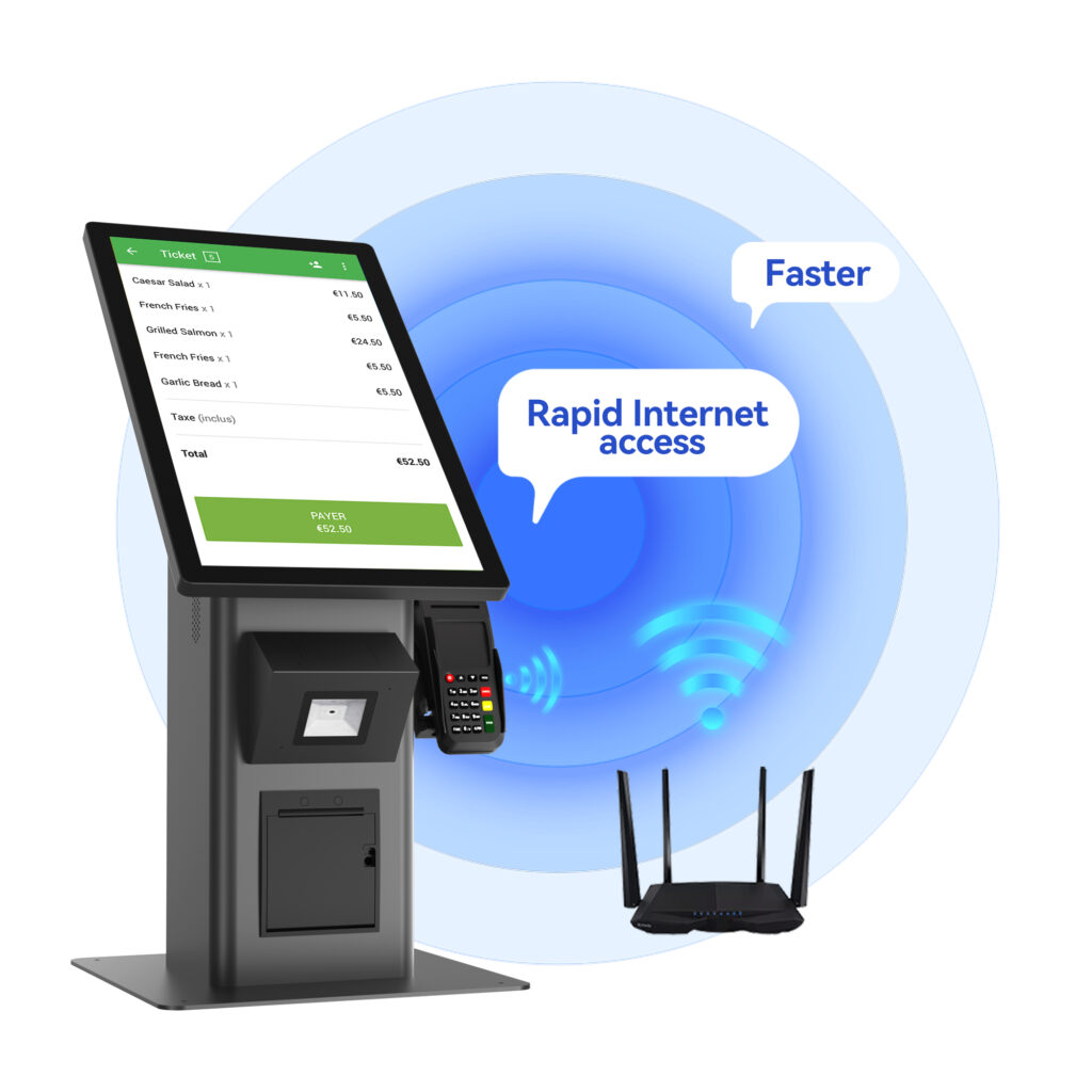 Customize your POS self-service kiosk with optional peripherals, including a built-in printer, QR code scanner, card reader, camera, and LED status light, creating a fully integrated solution tailored to your business needs.