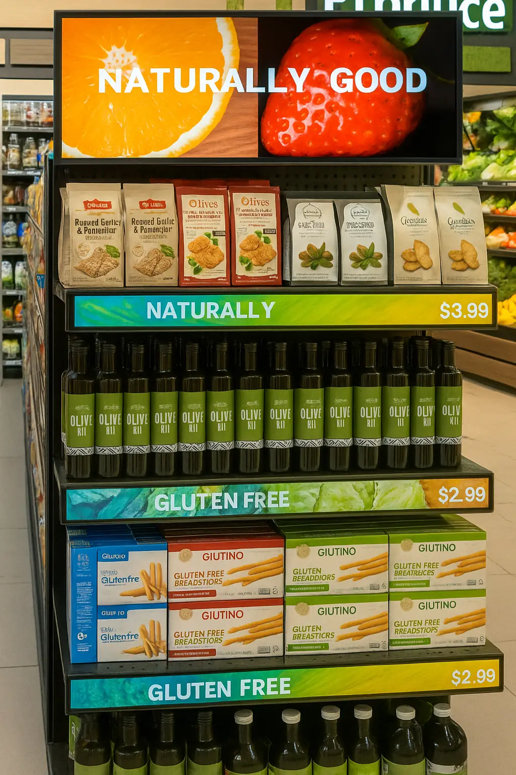 Our DXB series of digital shelf displays fit perfectly and seamlessly in front of standard shelves, providing customers with an engaging and dynamic shopping experience.